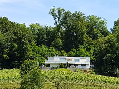 Untergeschoss Putz weiss, Obergeschoss weisse Holzfassade, komplett überarbeitet 2022